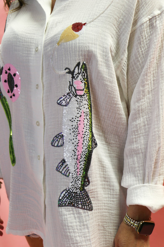 White Fishing Pole With Hooked Fish Gauze Button Up Collar Dress