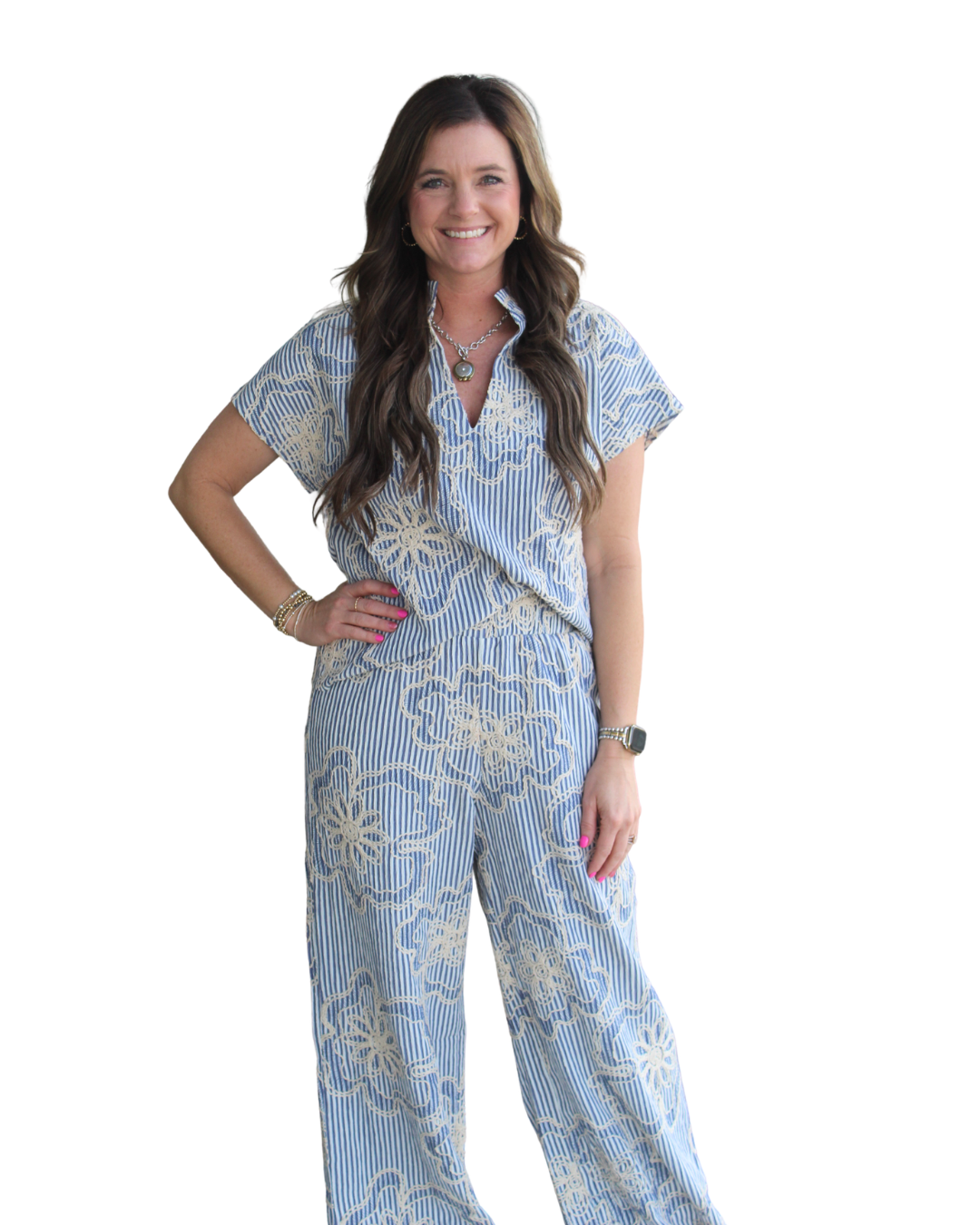 Short Slv Striped Floral Embroidery Top